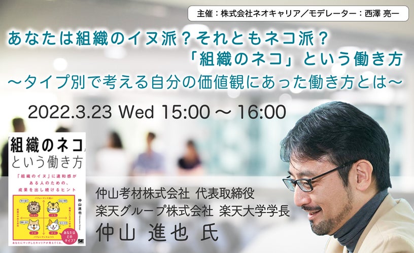 株式会社ネオキャリア(本社:東京都新宿区、代表取締役:西澤亮一、以下ネオキャリア)は、様々な経営課題を解決するためのヒントを得る場として、企業向けのオンラインセミナー『ネオキャリア週刊ウェビナー』を開催しております。2022年3月23日(水)は、仲山考材株式会社 代表取締役 兼 楽天グループ株式会社 楽天大学学長 仲山 進也 氏をゲストにお招きし開催いたします。