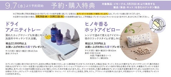 イモーテル、9月28日(水)より発売する製品(単品・キット)を含むロクシタン製品を税込22,000円以上お買い上げの方に「ドライアメニティー」を、税込14,300円以上お買い上げの方には「ヒノキ香るホットアイピロー」を先着でプレゼントいたします。