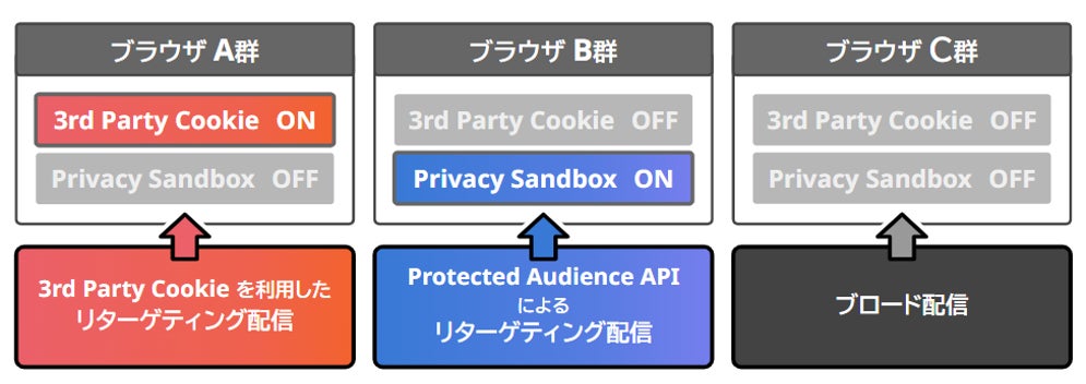 また、2024年1月以降、Google が Chromeブラウザ の1%に対して 3rd Party Cookie(*4)へのアクセスを制限したこと(*5)を踏まえ、下記の通り、テストを実施する Chromeブラウザ を3つのブラウザ群に分けました。