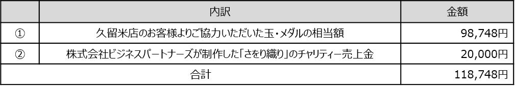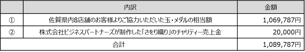 この度の支援活動におきましては、2021年3月1日から10月31日の期間、佐賀県8店舗および久留米店のお客様よりご協力いただいた玉・メダル相当額に、グループの特例子会社である株式会社ビジネスパートナーズが制作した「さをり織り」のチャリティー売上金を加え、佐賀県に1,089,787円、久留米市に118,748円をそれぞれ寄付させていただきました。