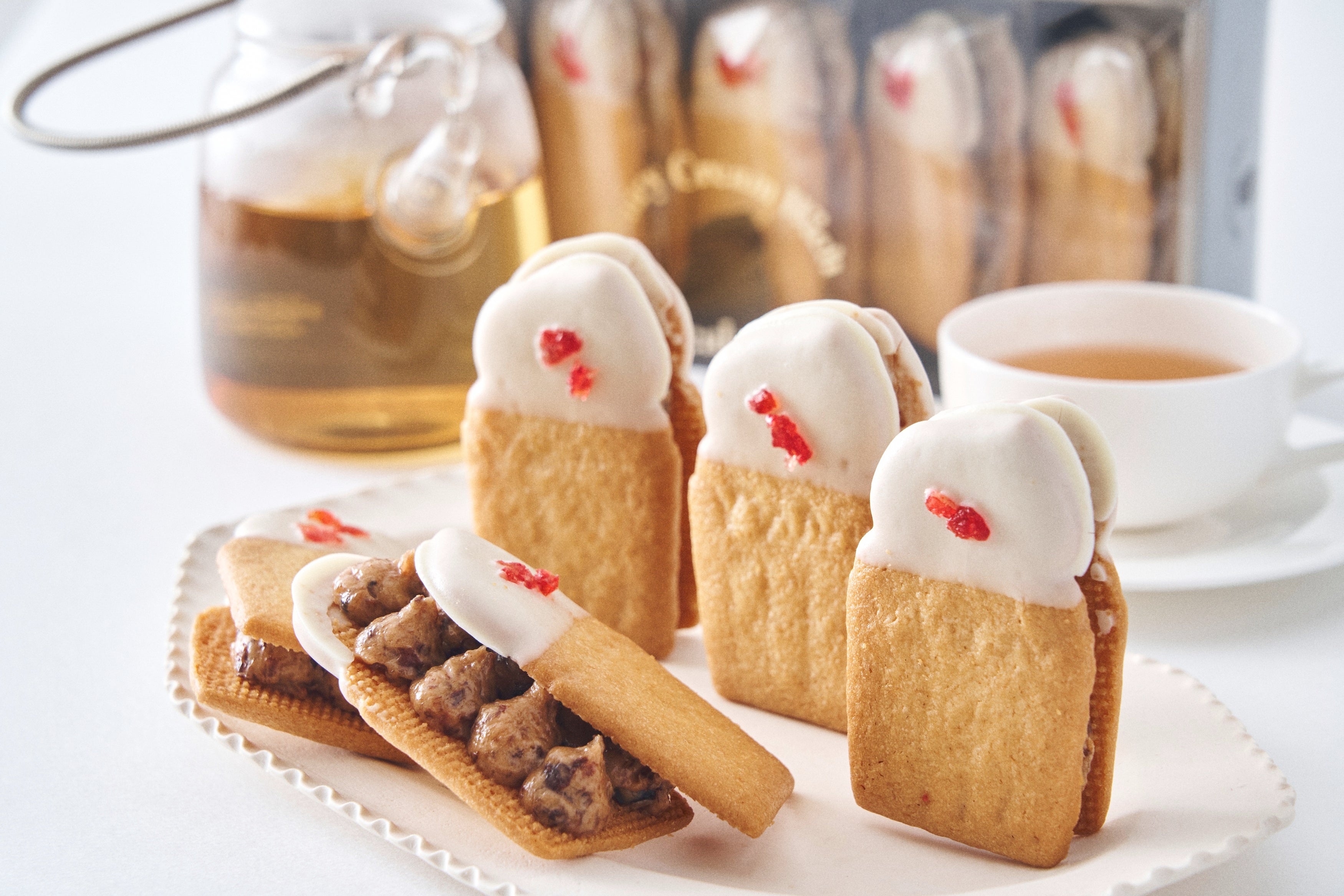 生クリーム入りのバタークリームに、細かく刻んだ洋酒漬けフルーツ5種(レーズン・オレンジピール・パイン・アップル・ドレンチェリー)を丁寧に練り込み、シナモンで全体をまとめた”フルーツケーキ生バタークリーム“を、ホワイトチョコレートでハーフコーティングした”ザクほろ“食感のビスケットへひとつひとつたっぷり絞ってサンド。甘くスパイシーな香りに、フルーツのつぶつぶ感とバターのまろやかなコクは、まるでフルーツケーキを食べているようなレトロな味わいです。