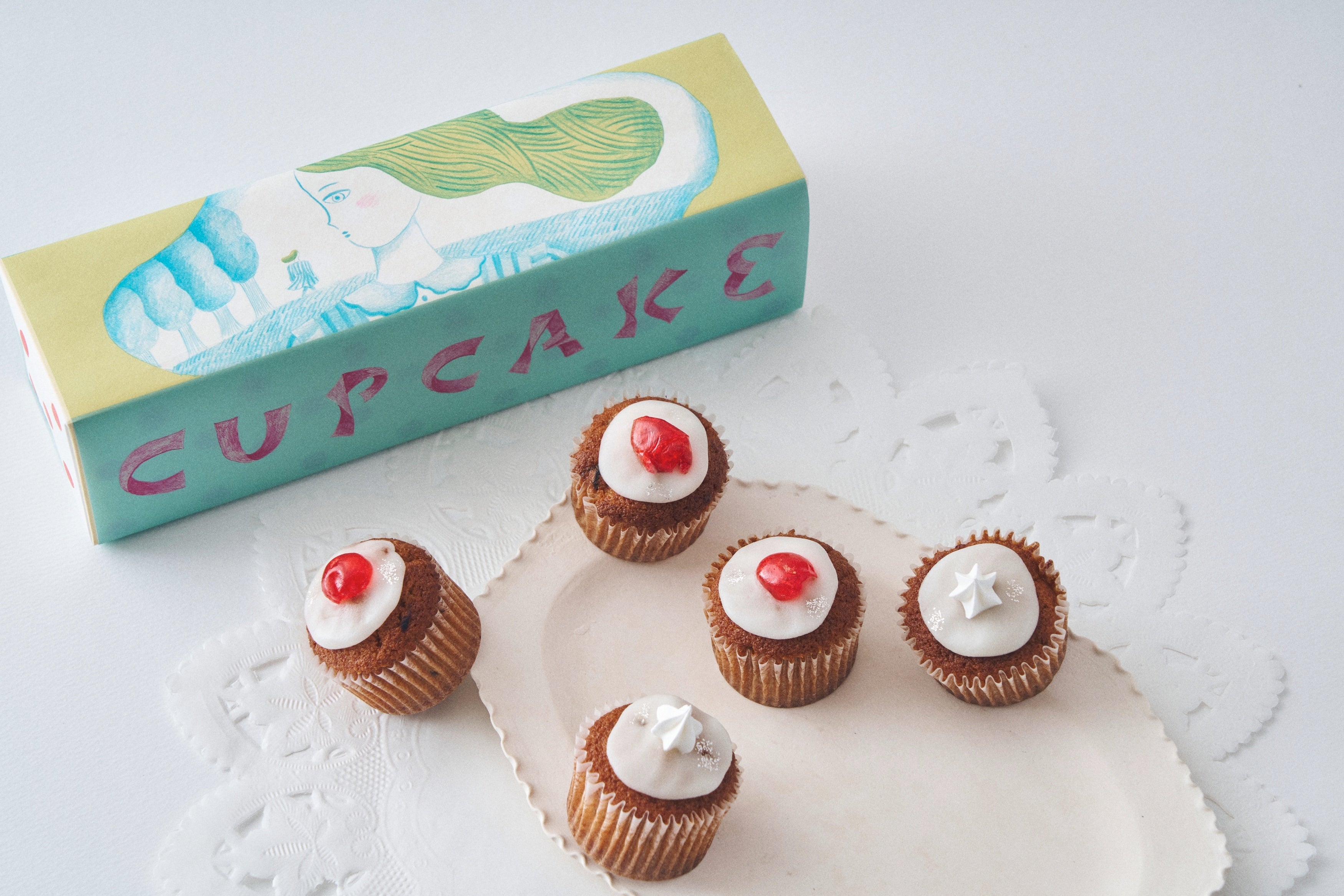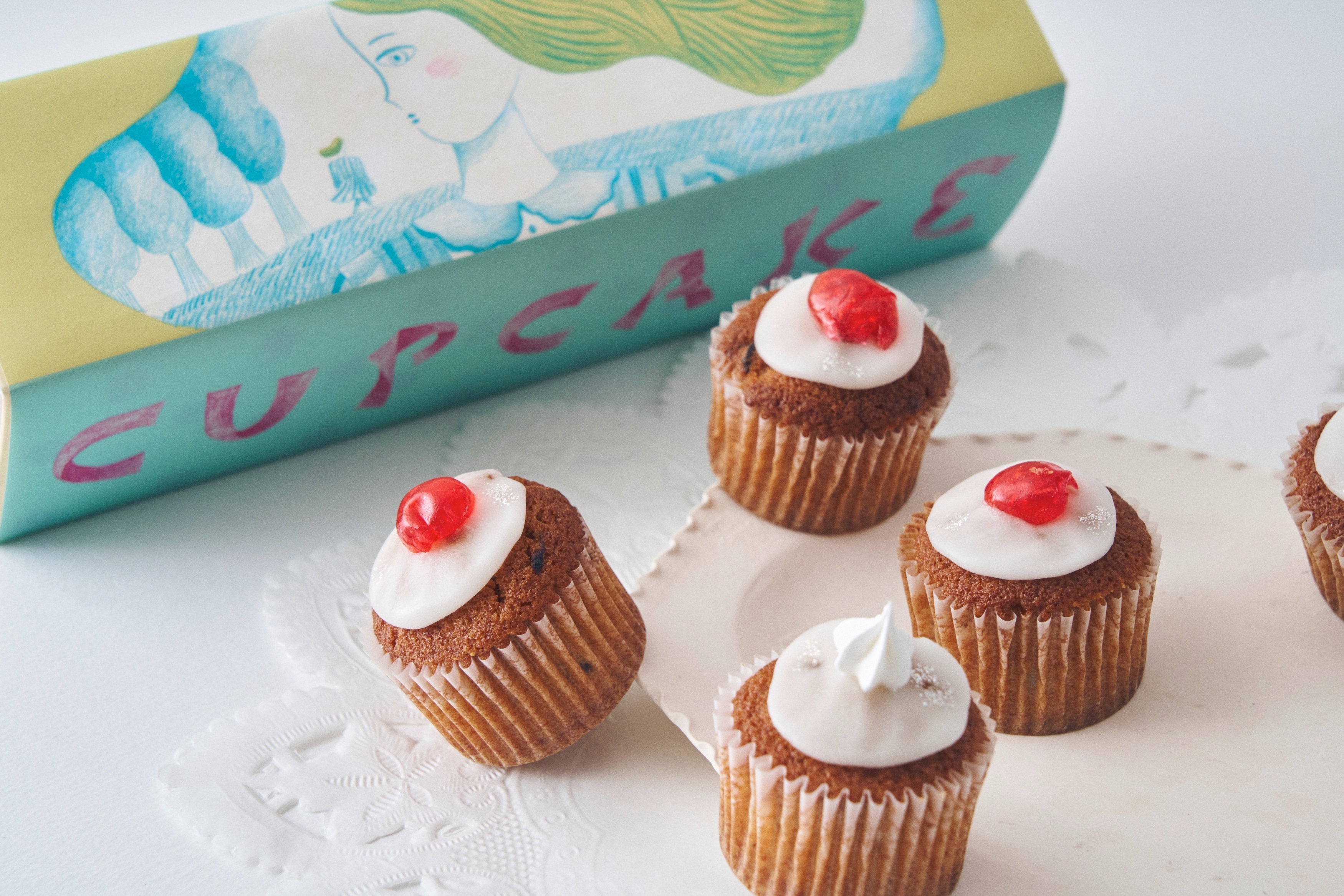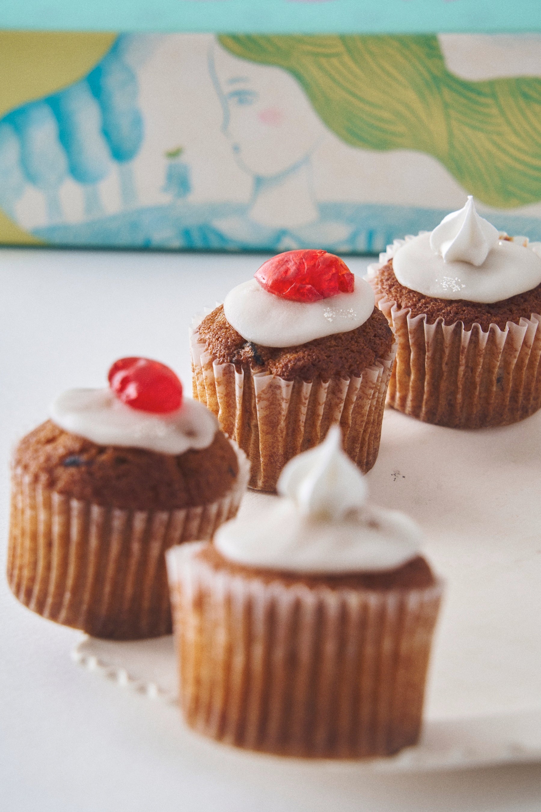 洋酒で熟成させたフルーツ(レーズン・オレンジピール・パイン・アップル・ドレンチェリー)を刻んでたっぷりと混ぜ込んだシナモン香るフルーツケーキを、焼き菓子カップケーキに仕上げました。ふんわり焼き上げたケーキには、バニラアイシングをのせて、赤く艶やかなドレンチェリーや雪のような白いメレンゲをトッピング。
