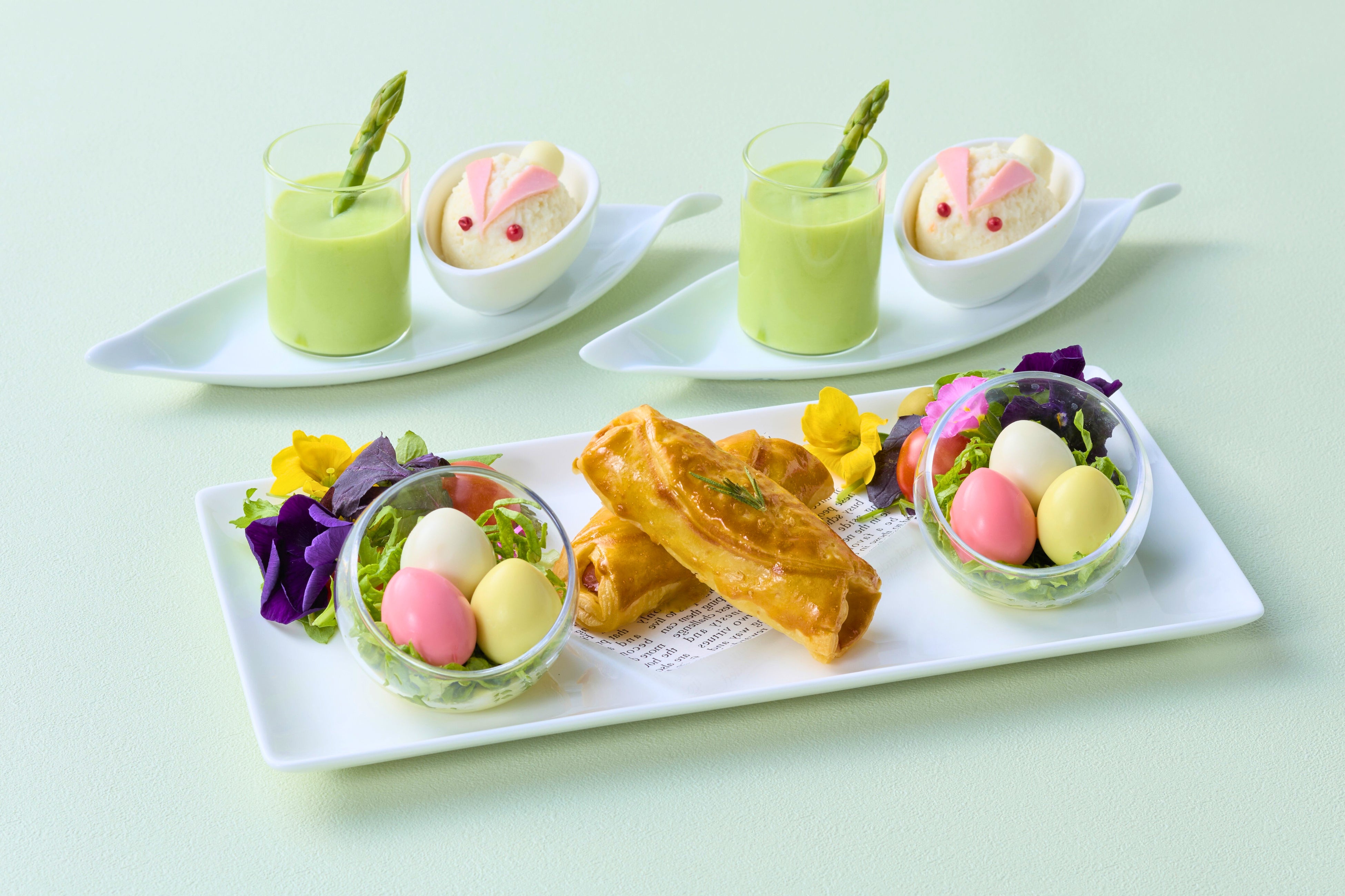 うさぎのポテトサラダ/グリーンアスパラガスの冷製ポタージュ/イースターエッグ うずらたまごの巣ごもり~3色たまごとワカモレディップ~/粗挽きソーセージのショッソンパイ/お花畑のガーデンサラダ