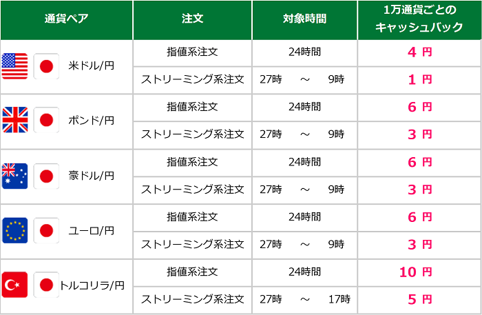 キャッシュバック対象時間中のパートナーズFX 「米ドル/円」・「ポンド/円」・「豪ドル/円」・「ユーロ/円」・「トルコリラ/円」における新規・決済約定数量の合計に対して、指値注文・ストリーミング注文ごとに下記表のとおり上限100万円までキャッシュバックいたします。