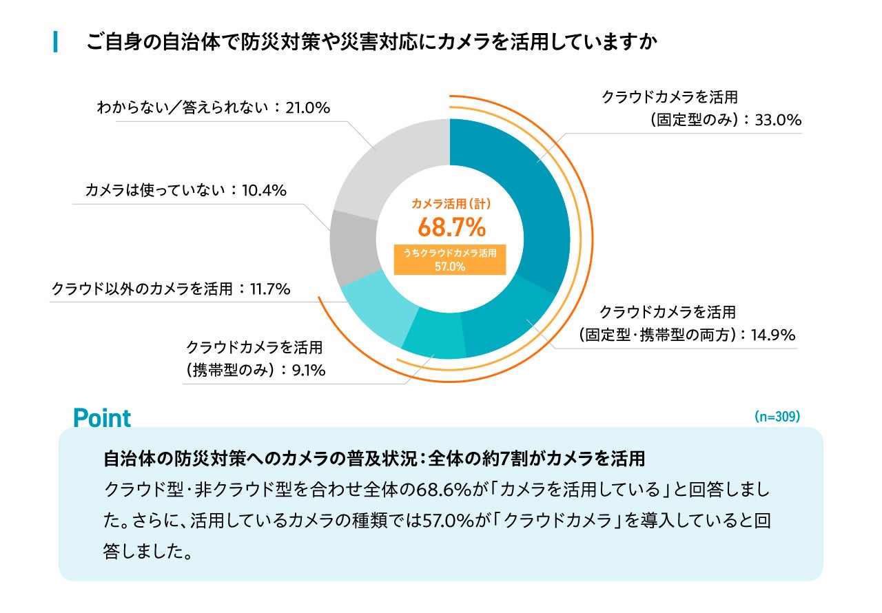 自治体の防災対策におけるカメラの活用状況を調査したところ、クラウド型・非クラウド型を合わせ全体の68.6%が「防災対策や災害対応にカメラを活用している」と回答しました。