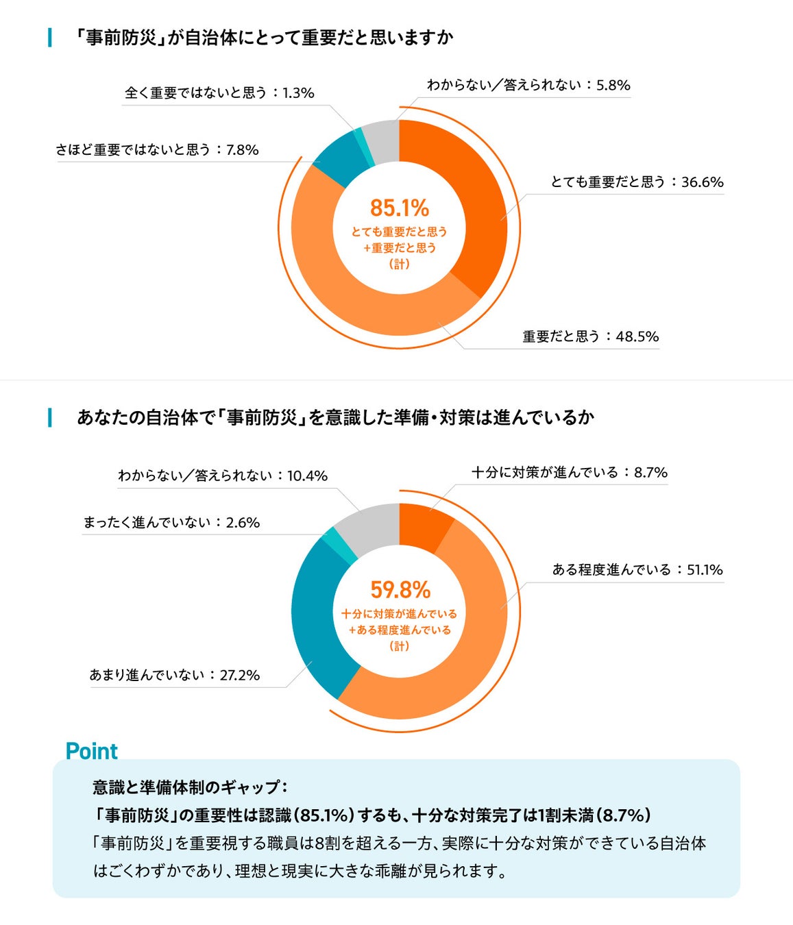 本調査では、自治体職員の85.1%が「事前防災」を重要視していることが分かりました。しかし、その進捗について「十分に対策ができている」との回答はわずか8.7%に留まり、意識の高さと実行フェーズの間に大きなギャップがあることが浮き彫りとなりました。