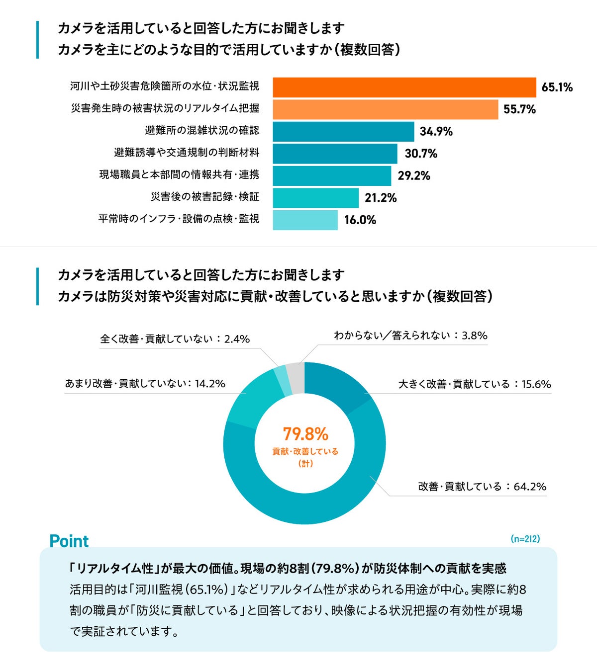 実際、カメラを活用している職員の約8割(79.8%)が「防災体制の改善・貢献につながっている」と回答しており、映像による状況把握の有効性が現場で既に実証されていることが分かります。