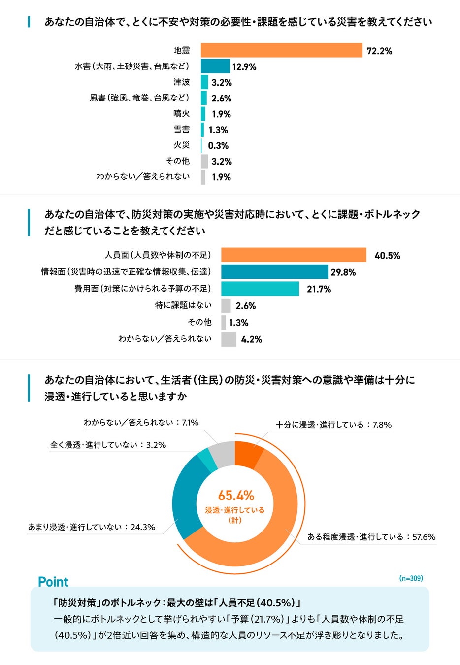 また、住民の防災意識の浸透状況については、65.4%が「十分に浸透している/ある程度浸透している」と回答する一方で、約3割(27.5%)が「不十分」と感じており、自治体側の備えだけでなく、住民への啓発・情報提供のあり方も喫緊の課題となっています。