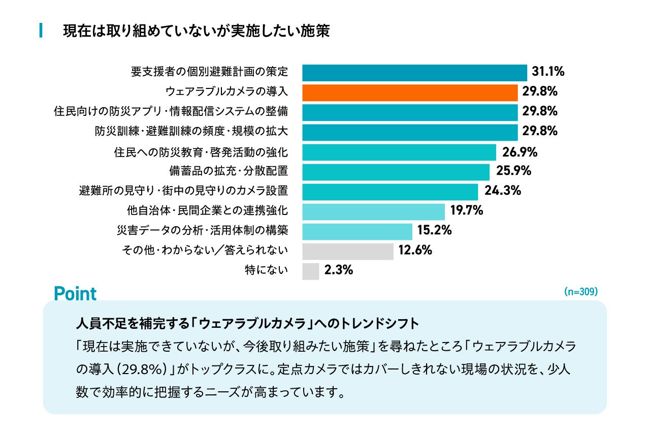 「現在は実施できていないが、今後取り組みたい施策」を尋ねたところ、「ウェアラブルカメラの導入(29.8%)」が防災アプリや訓練と並び上位に挙がりました。