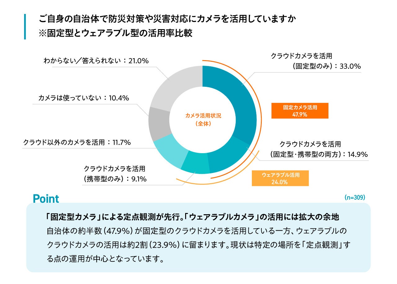 回答全体(n=309)における活用状況を詳しく見ると、「固定型のクラウドカメラ」を活用している自治体は47.9%にのぼる一方、「ウェアラブル(携帯型)のクラウドカメラ」の活用は23.9%にとどまっています。