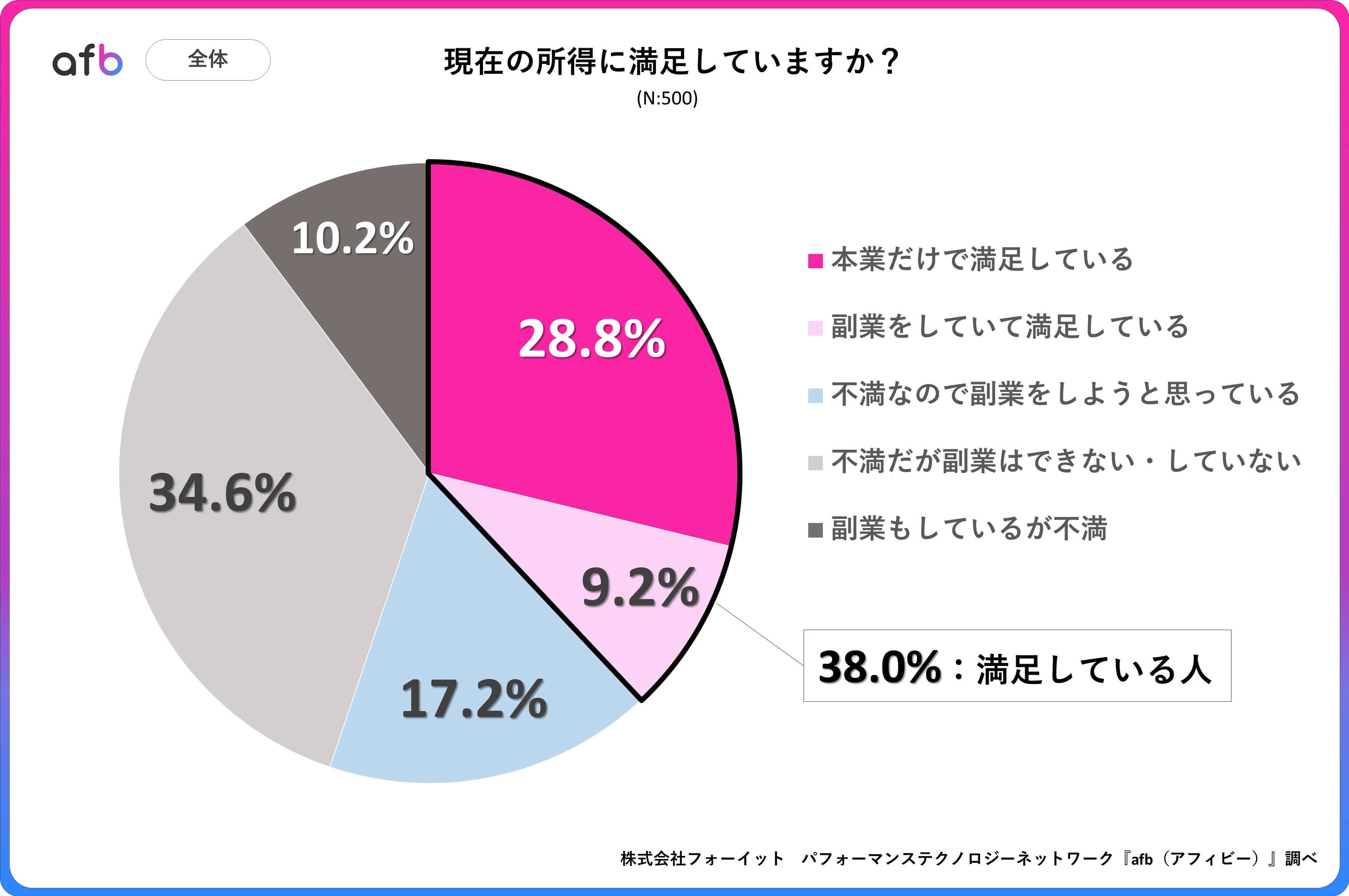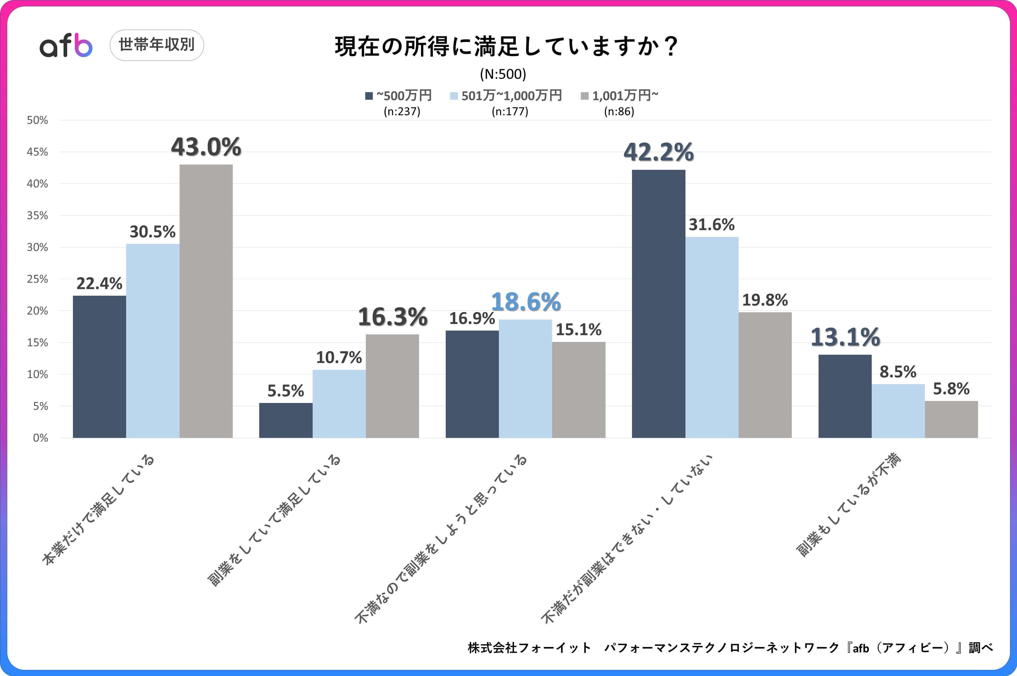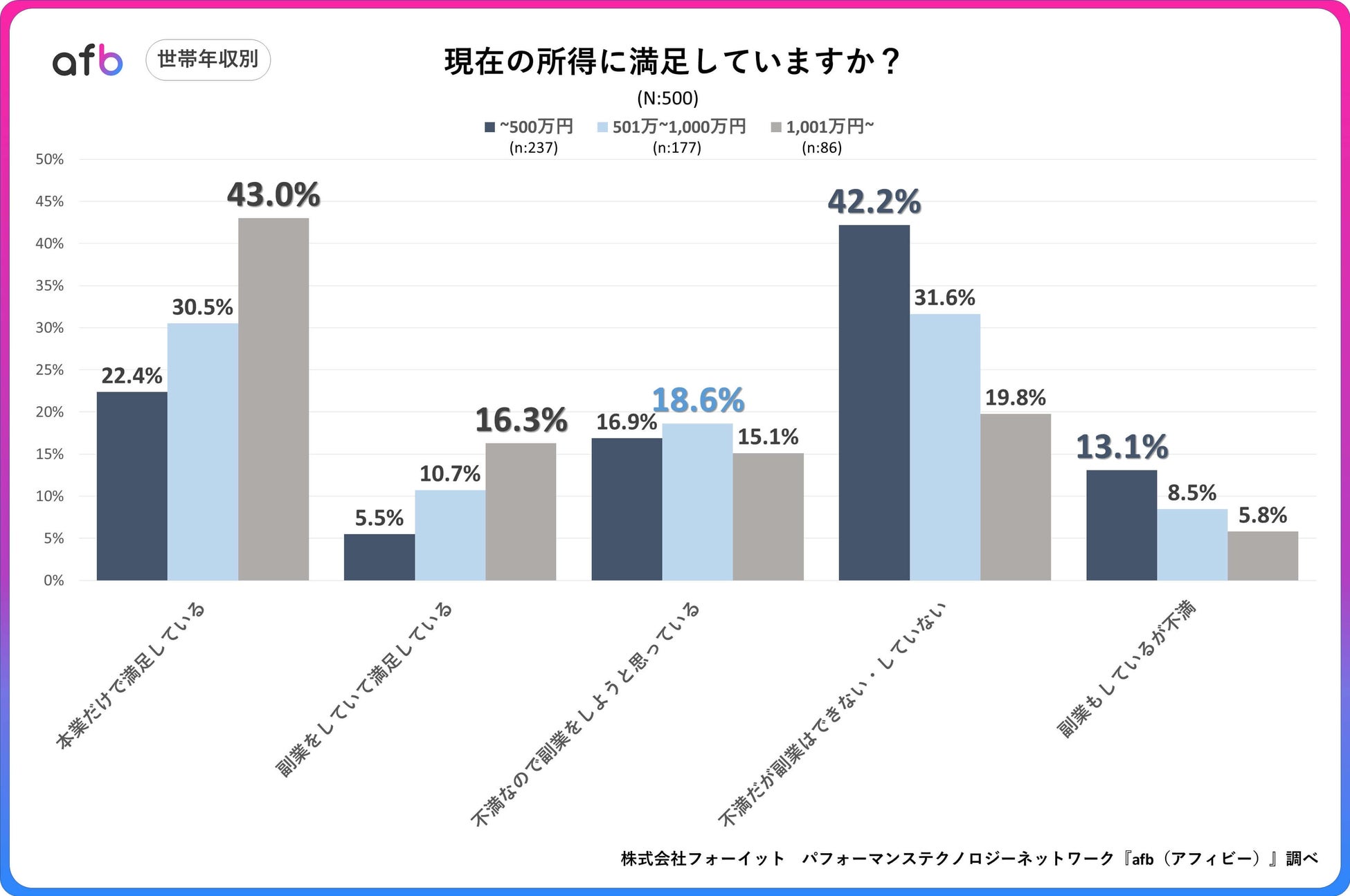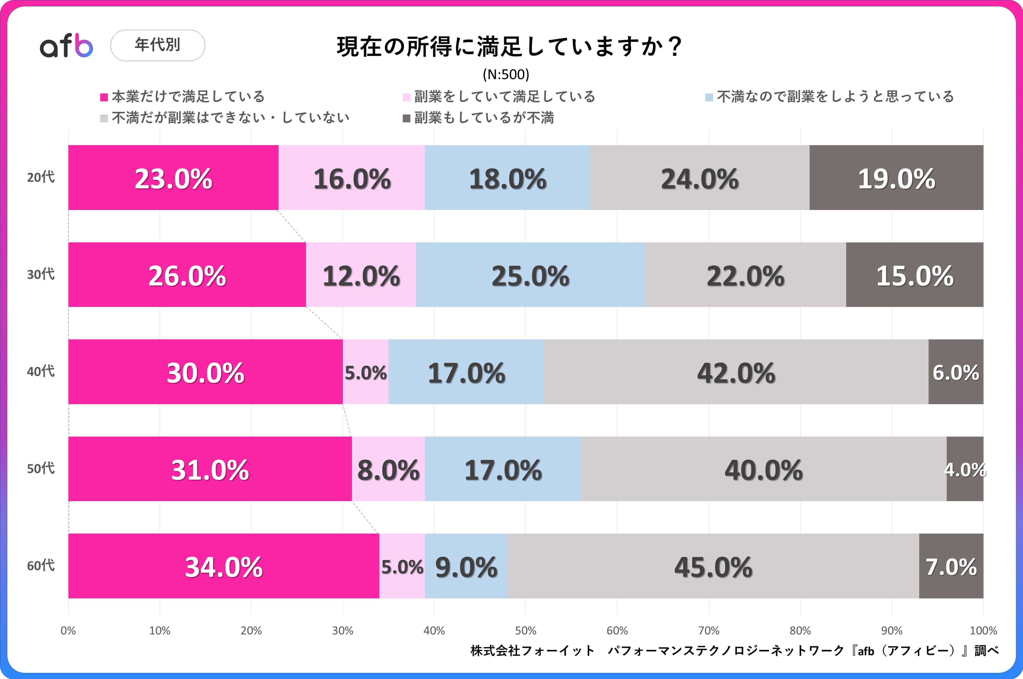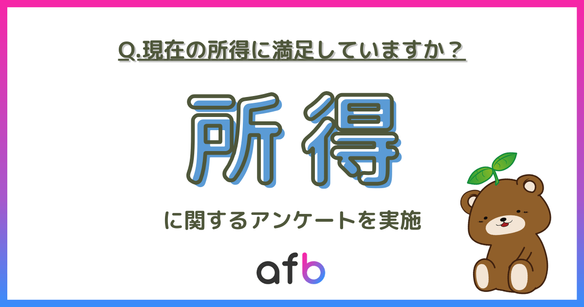 パフォーマンステクノロジーネットワーク「afb(アフィビー)」< https://www.afi-b.com/ >の開発運用をおこなう株式会社フォーイットは、全国の10代~60代までの男女500人を対象に所得に関するアンケートを実施し、年代別・男女別等の特徴についてまとめました。