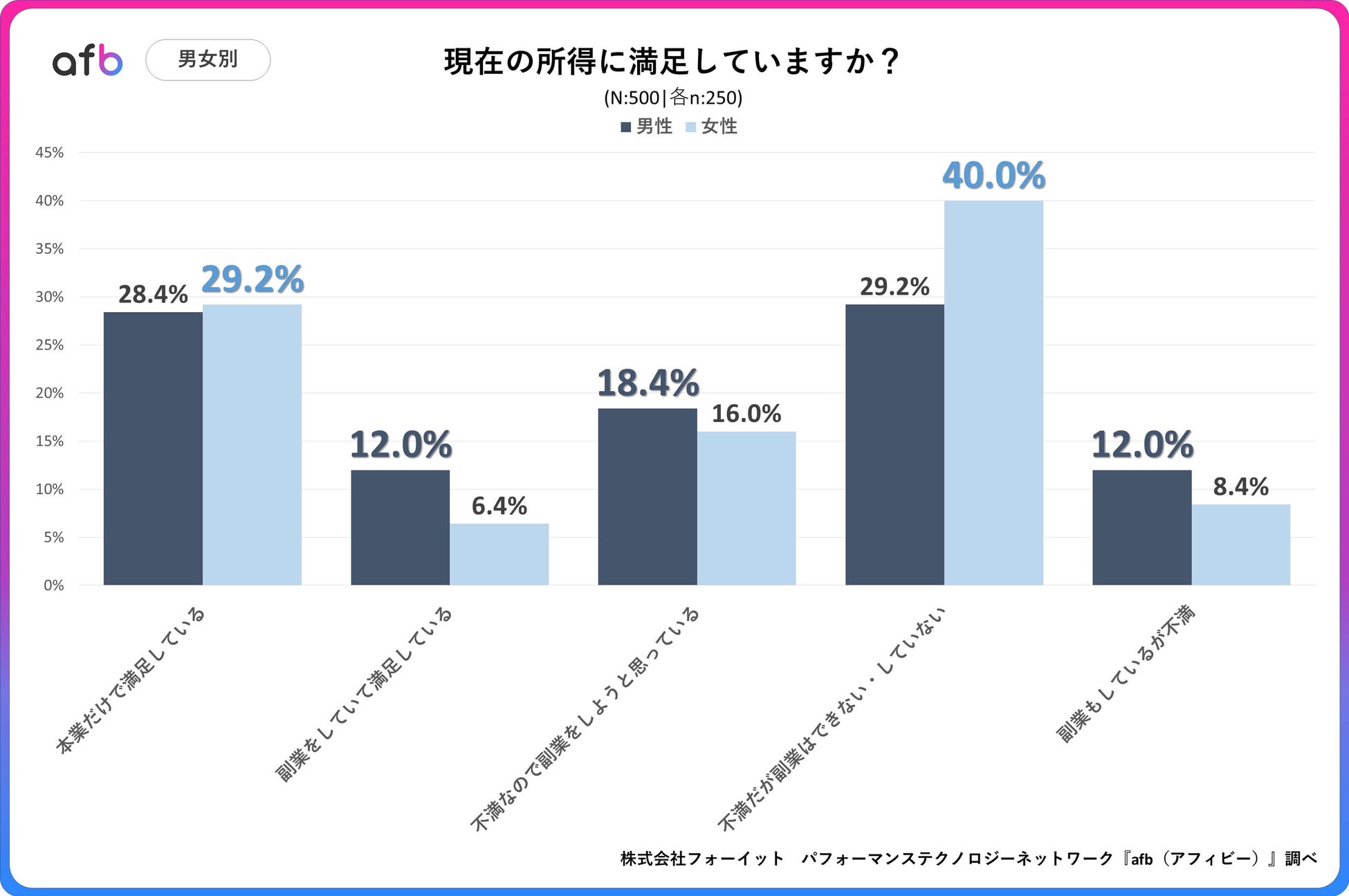 男女別で見ると、最も差が大きかった回答は「不満だが副業はできない・していない」で、男性が29.2%だったのに対して女性は40.0%となり、10%以上の差が生まれました。