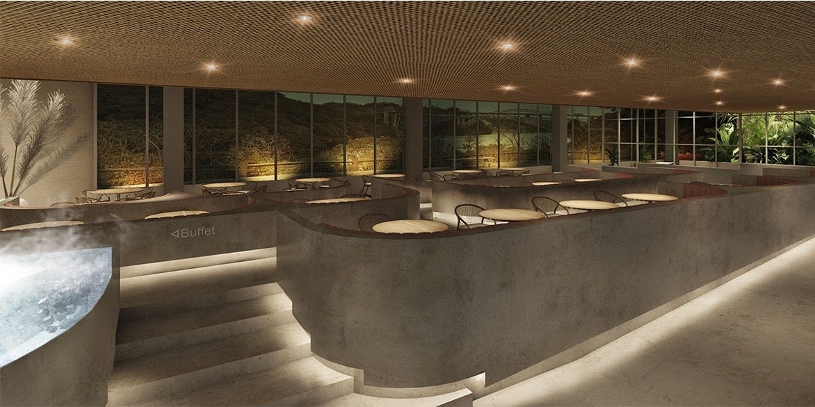 レストランは、西海橋を望む客席を新設。窓に向かってシアター形式で高低差のあるテーブル配置を行い、西海橋の雄大な風景をお食事と共にお楽しみいただける空間が登場いたします。