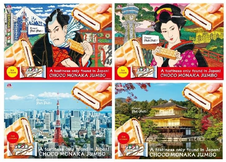 訪日外国人の皆様に日本でしか食べられないチョコモナカジャンボを一度味わっていただきたく、浮世絵風に描かれた日本を代表する人気観光地などに「A tastiness only found in Japan」(日本にしかない美味しさ)のコピーが入った広告を、東京駅/羽田空港/京都駅/関西国際空港にて3月1日から掲出しております。