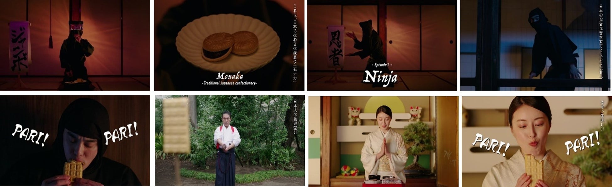 今回、放映する動画は、音を立てずに忍び寄る忍者でさえも「チョコモナカジャンボ」を食べると“PARI!PARI!”と音がしてしまう、モナカの特徴を紹介。その他2タイプあり、2つ目は師範が刀でスパッと「チョコモナカジャンボ」を半分に切り、義理堅い日本人が仲間と分け合おうとしますが、そんな大変なことは不要で簡単に手で割れることを紹介。3つ目は着物姿の大和撫子が登場。マナーを大切に箸で食事を綺麗に食べますが、「チョコモナカジャンボ」を見た瞬間、思わず手で持ってかぶりつきたくなる美味しさであることを紹介しています。