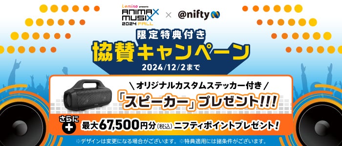 本キャンペーンは、「ANIMAX MUSIX 2024 FALL」への協賛を記念して実施するもので、2024年10月25日(金)~12月2日(月)の期間中に「@nifty光」または「@nifty光 10ギガ」の申し込みを行い、その後開通が確認できた方を対象に、ニフティポイント最大67,500円分(税込)(注1)に加え、本キャンペーン限定の「ANIMAX MUSIX協賛限定特典」をプレゼントします。