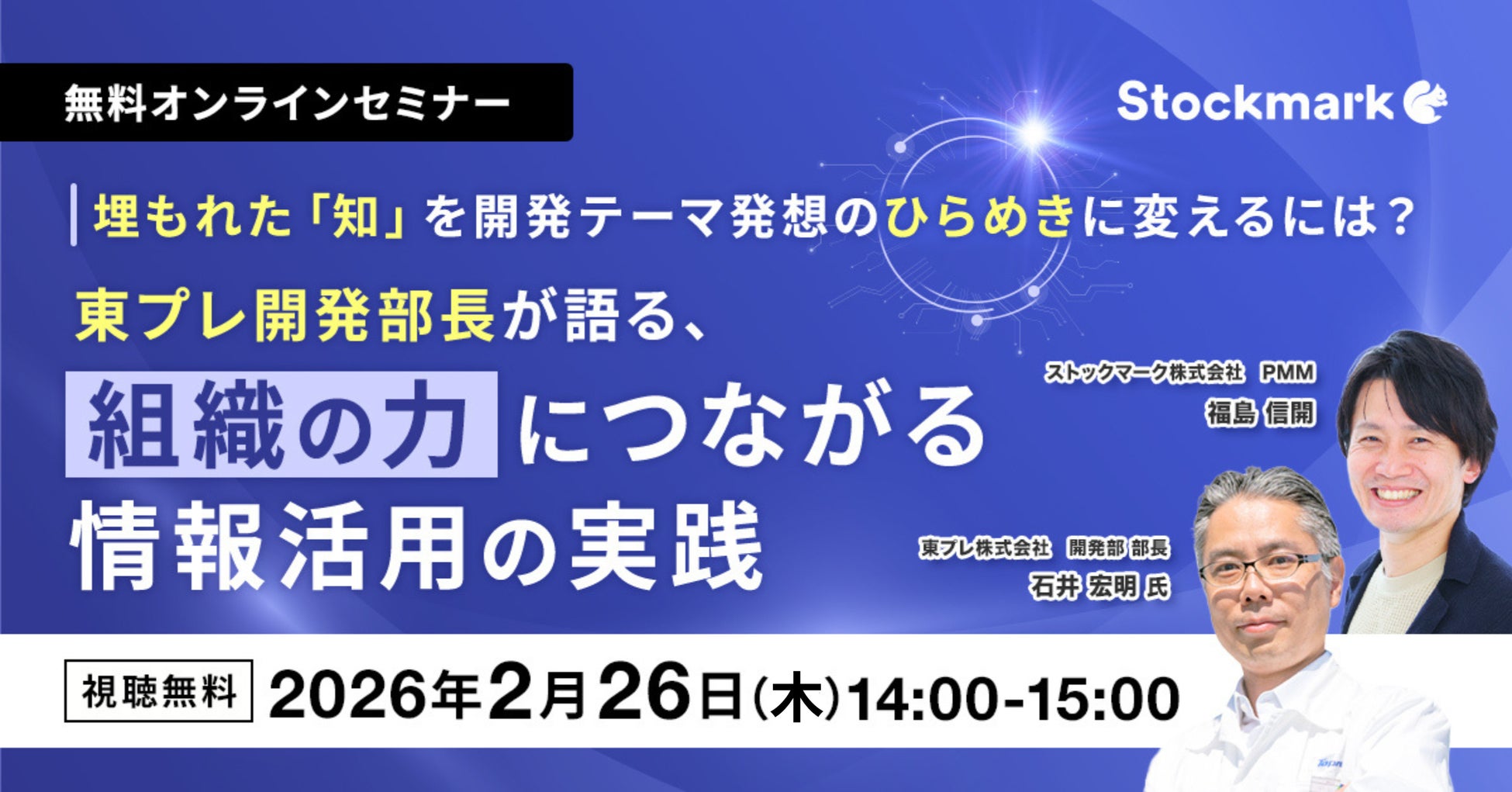 【2月26日(木) 無料セミナー】『埋もれた「知」を開発テーマ発想のひらめきに変えるには?―東プレ開発部長が語る、組織の力につながる情報活用の実践』(ストックマーク主催)