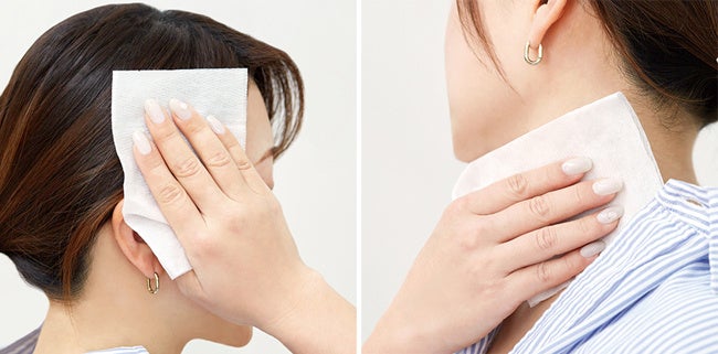蒸れてベタつく汗やニオイをさっぱり拭きとる、頭皮や髪にも使える冷感汗拭きシート。ひんやり気持ちいい清涼成分メントールにヒアルロン酸*1やコラーゲン*2などの保湿成分とコンディショニング成分を配合。髪や肌をうるおして整えながらスッキリ爽快に。