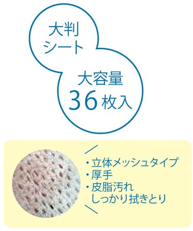 使いやすい大判厚手の立体メッシュシートが皮脂汚れやニオイをからめ取りながら、しっかり拭きとります。たっぷり使えてうれしい大容量36枚入り。