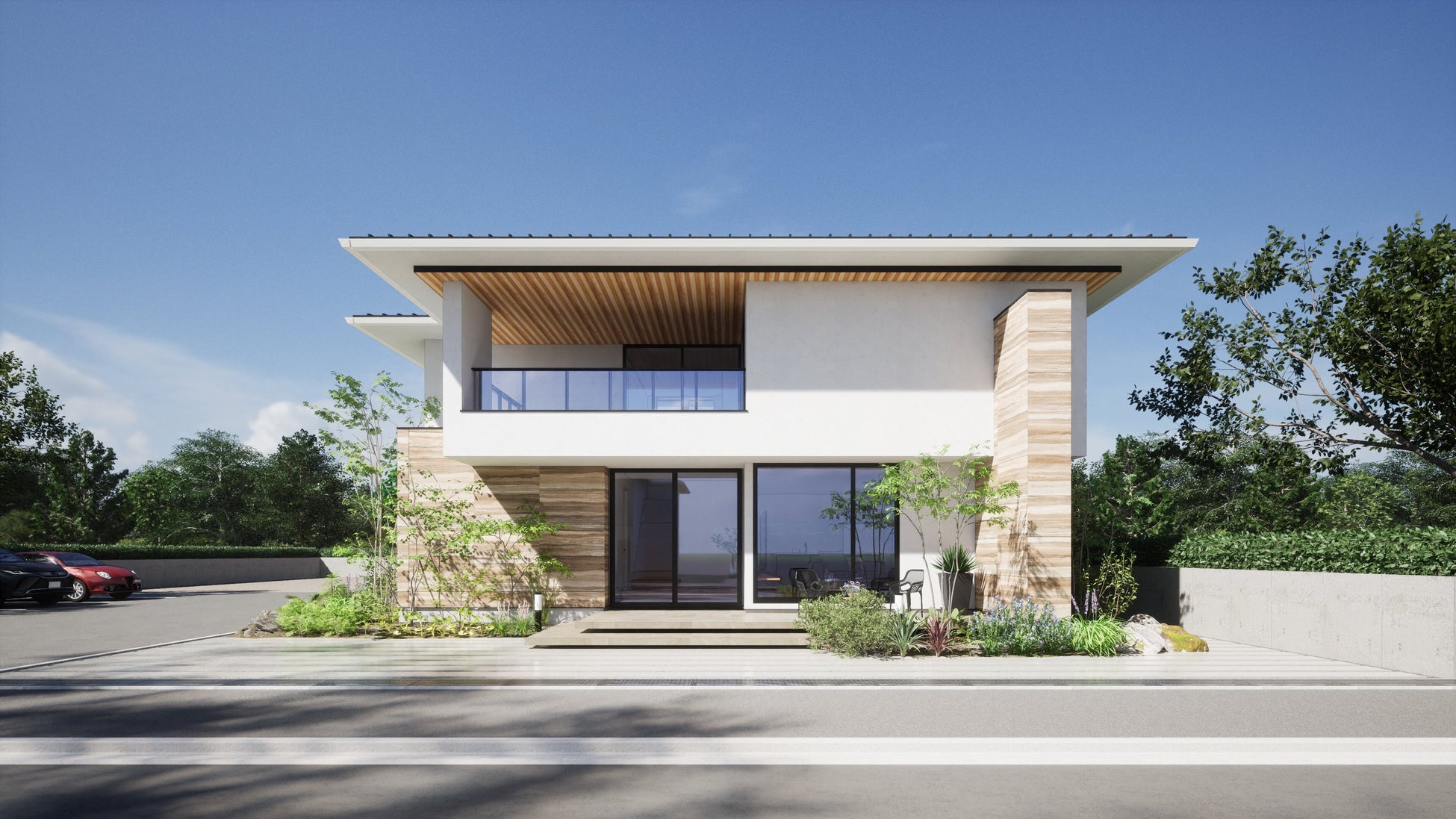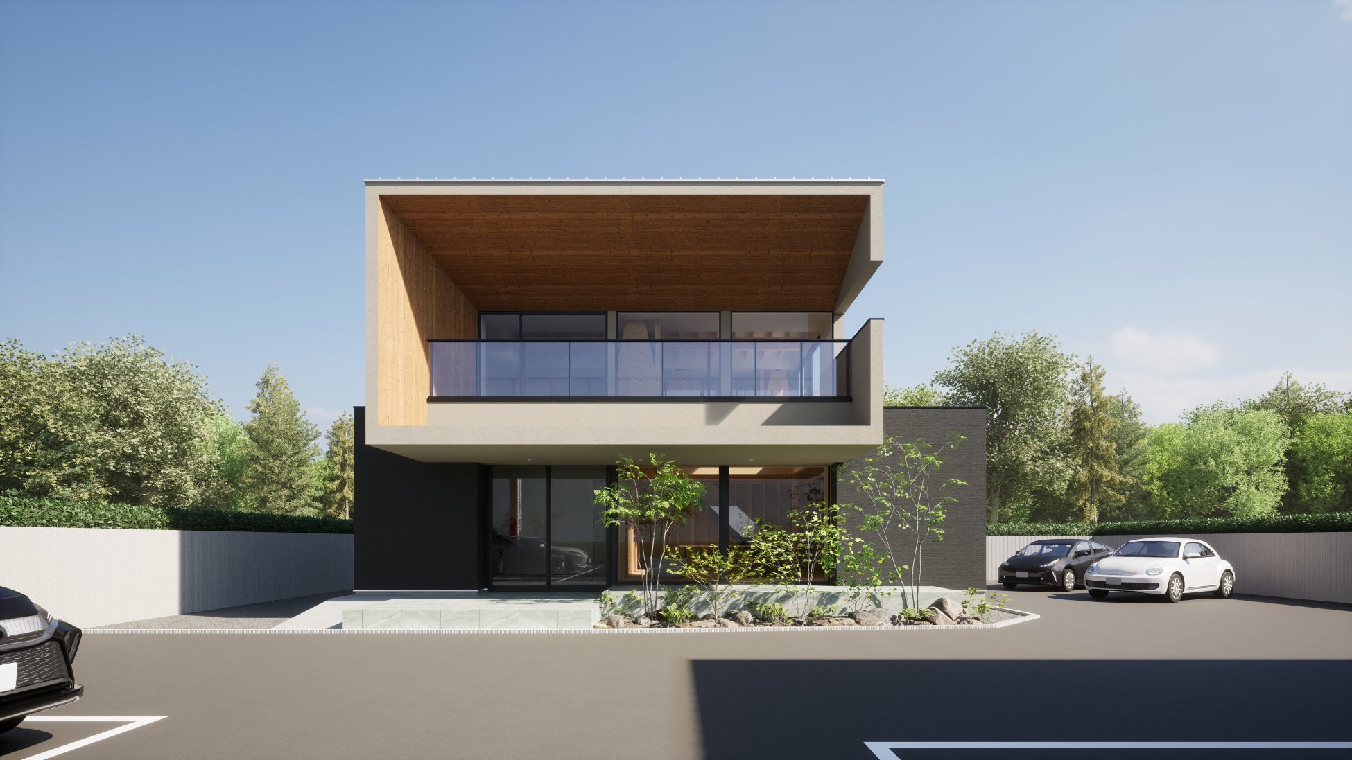 家族の毎日を豊かに彩る、開放感あふれる住まい。水平ラインを意識させる深い軒とオーバーハングで建築の力強さを演出。外観は白と黒のコントラストを基調とし、地層のような土の重なりが美しい版築柄のアクセントタイルと軒天の木目を自然素材にすることで、植栽との調和により力強さと自然の美しさを感じられます。