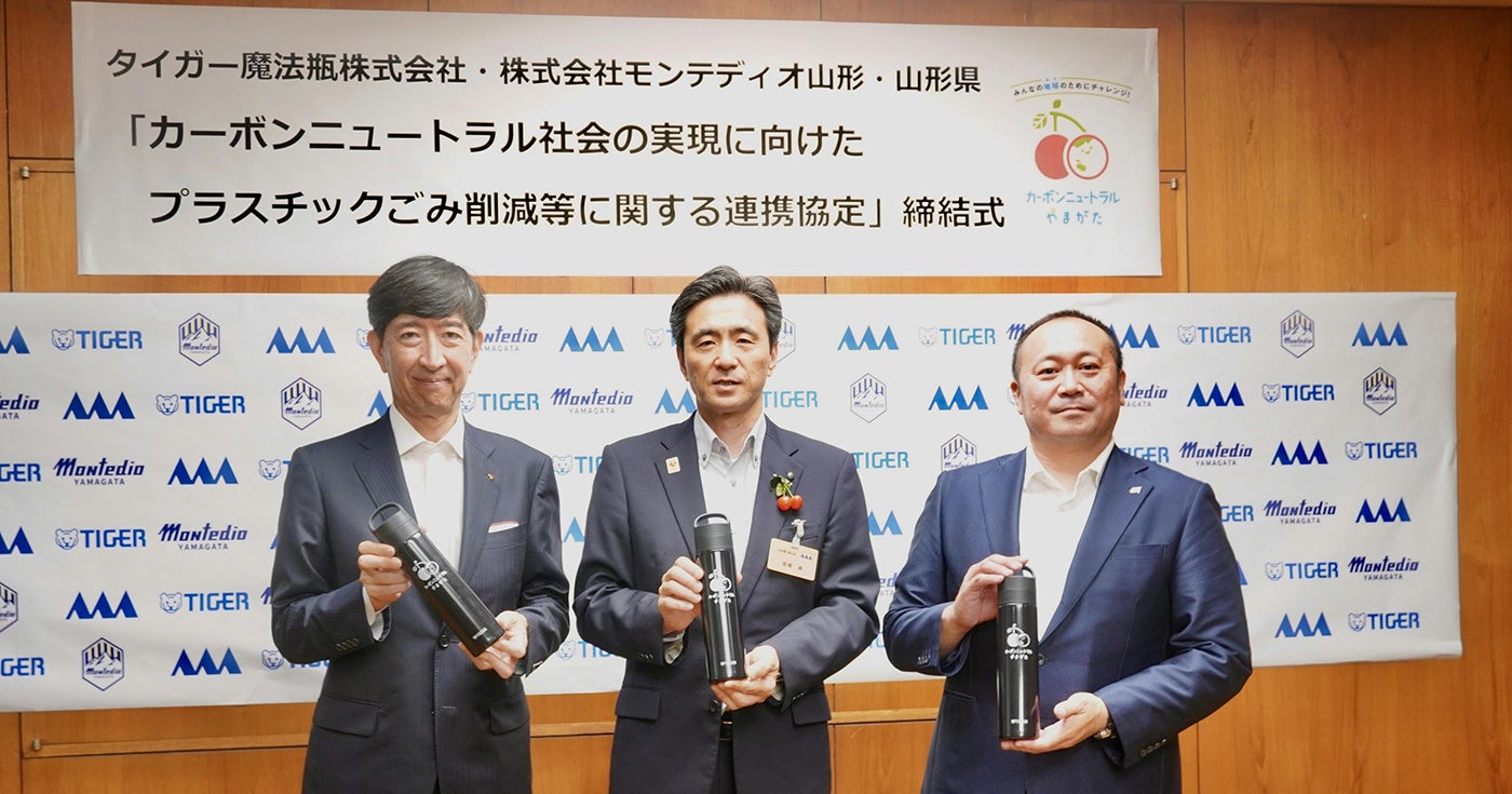 山形県×モンテディオ山形×タイガー魔法瓶が「カーボンニュートラル社会の実現に向けたプラスチックごみ削減等に関する連携協定」を締結