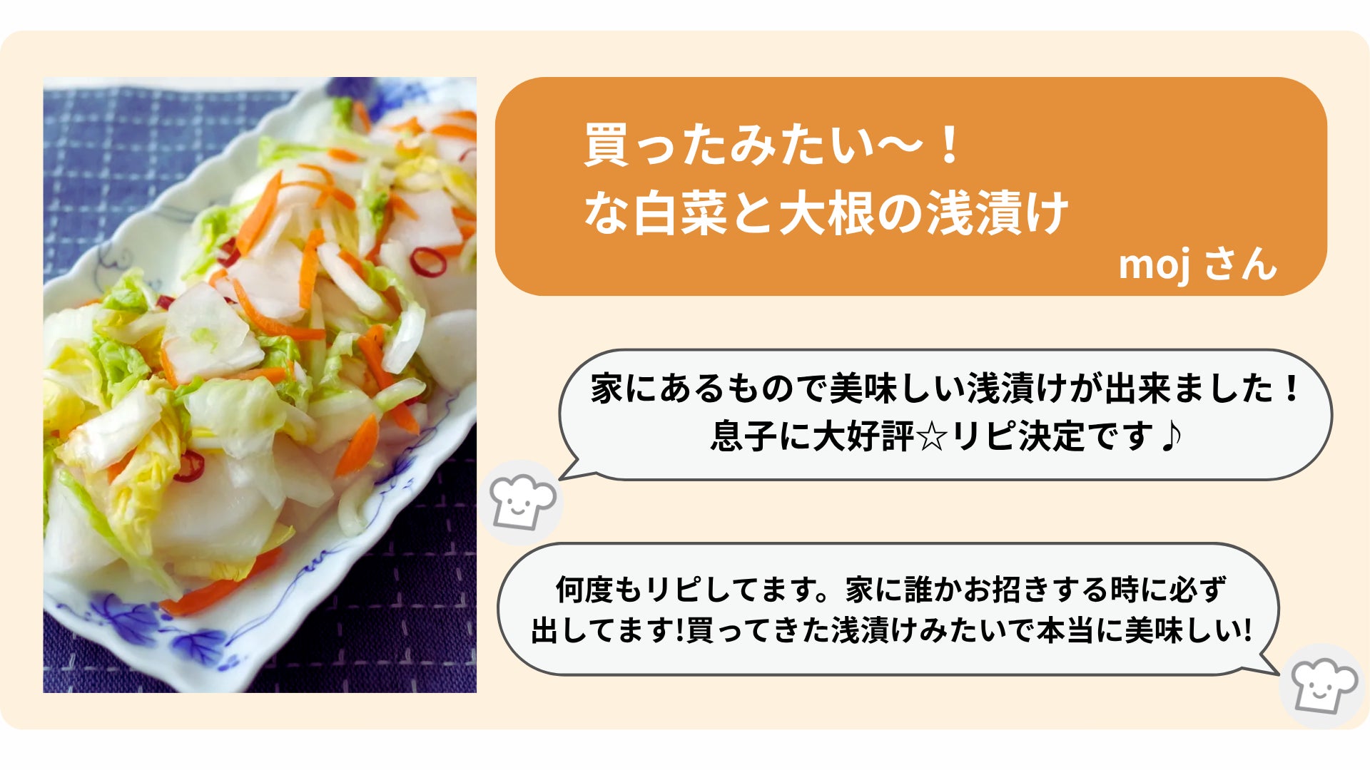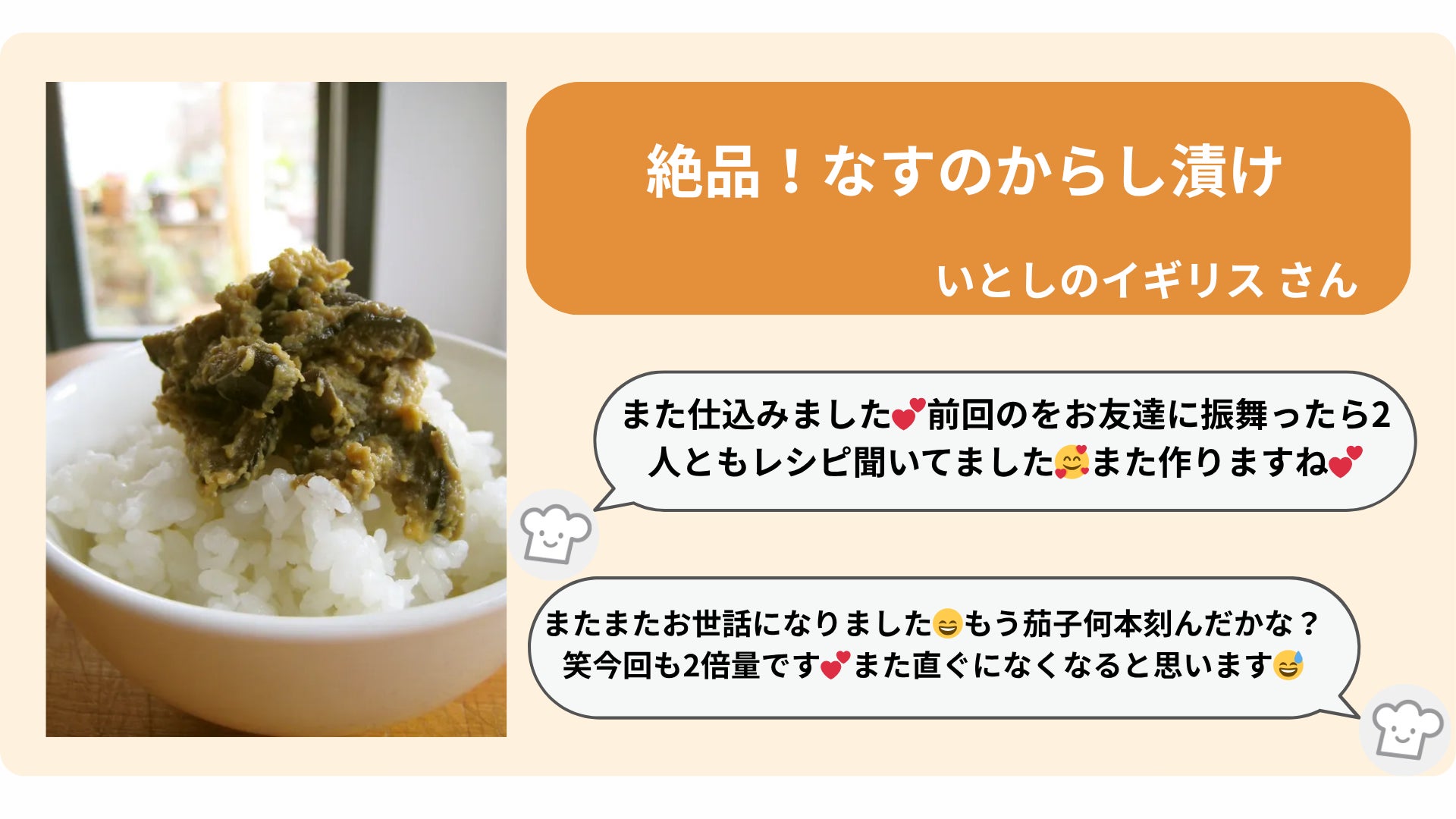 「自分好みの味」「家族が喜ぶ味」を追求できる暮らしの営み──旬の野菜を漬けて保存する知恵、時間を味方につける調理法。こうした知恵の循環を、クックパッドは今後も支援してまいります。