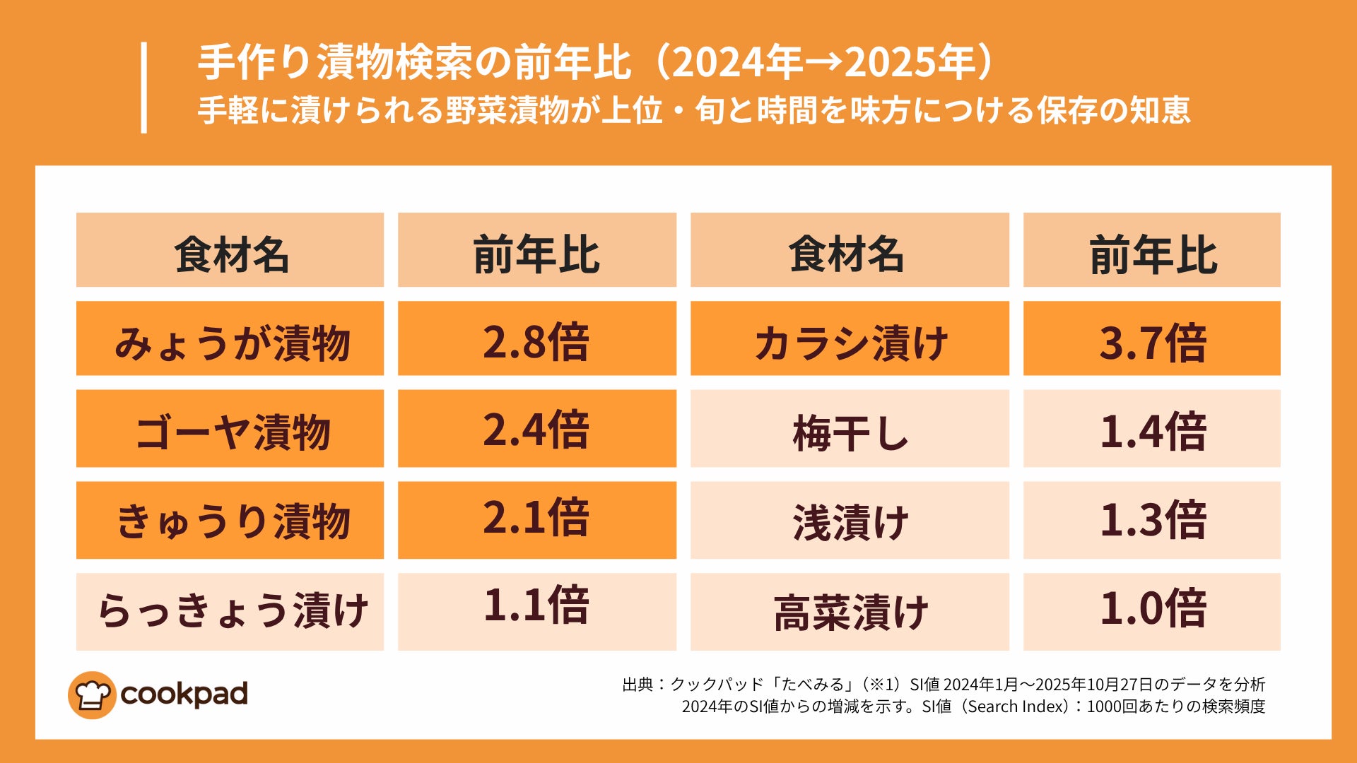 こうした中、家庭では「自分で漬ける」選択が広がっています。クックパッドの食の検索データサービス「たべみる」で漬物関連の検索動向を分析したところ、手作り漬物への関心が高まっていることが明らかになりました(※3)。
