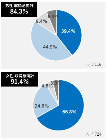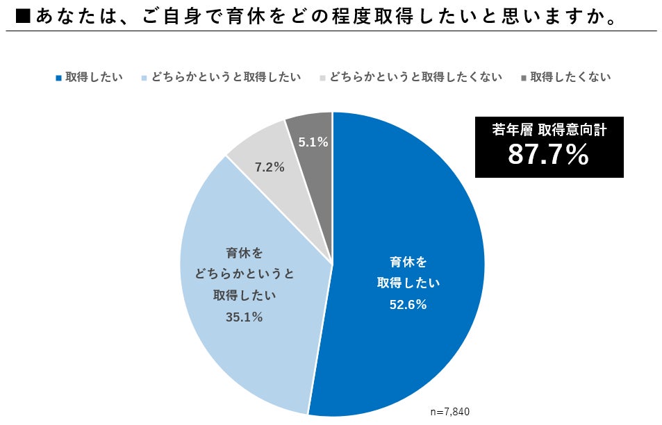 また、若年層に「自分自身は育休を取得したいか」と尋ねたところ、「取得したい」が87.7%と9割近い結果になりました。男女別では、女性91.4%、男性84.3%と、多少の男女差はあるものの、男女ともに9割程度の若年層が、育休取得意向がある結果となりました。