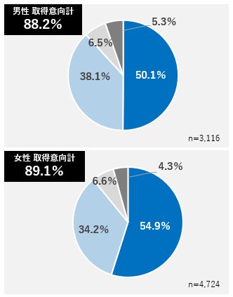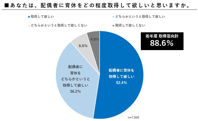 「配偶者に育休を取得してもらいたいか」の意向を尋ねると、88.6%が「配偶者に育休を取得してほしい」と回答しており、男女問わず、若年層の育休取得への意向の強さが明らかになりました。