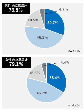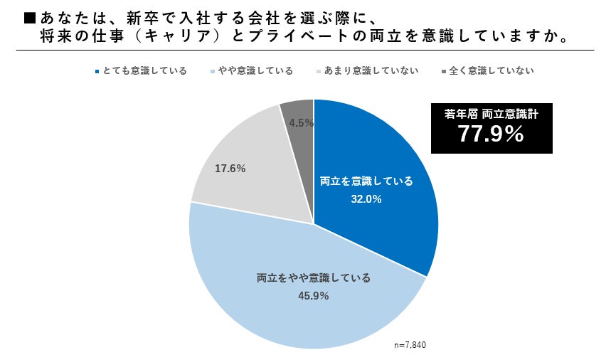「新卒で入社をする会社を選ぶ際に、将来の仕事(キャリア)とプライベートの両立を意識していますか」の問いに対し、77.9%(男女合計)が両立を意識していると回答しました。男女別では、男性の76.8%、女性の79.1%が、仕事とプライベートを両立できる働き方をしたいと思っていることがうかがえます。