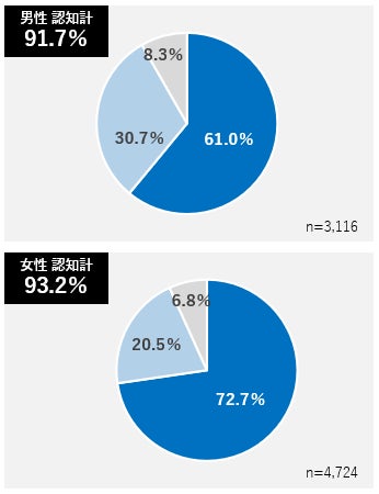 「育児休業制度」の認知度について、若年層の92.4%が「知っている」と回答しています。男女別でも90%以上が知っていると回答し、非常に高い結果となりました。「育児休業制度」の認知度を他の制度と比較した場合においても、若年層の90%以上が「育児休業制度」を認知しており、認知度が最も高い「年次有給休暇」(92.8%が知っていると回答)との差も僅か0.4ptでした。