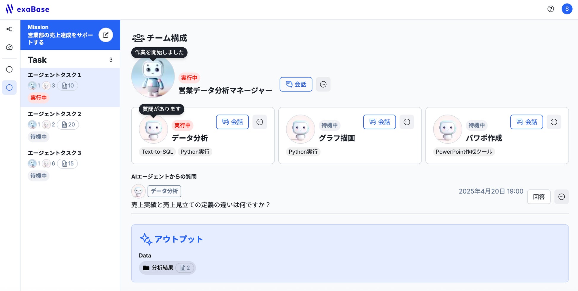 株式会社エクサウィザーズ(東京都港区、代表取締役社長CEO:春田 真、以下エクサウィザーズ)は、AIプラットフォームの「exaBase」が、様々な業務に対応可能なAIエージェントにグループで全面的に対応することをお知らせします。第1段階として2025年5月に、AIサービス開発環境の「exaBase Studio」を、自律型 *1を含めたAIエージェントを内製し、業務データを活用しつつ、人と対話することで育てていくプラットフォームとして利用できるようにします。日本企業の人手不足や生産性向上などの課題解決に向け、営業、人事領域を代表とするオフィスワーカーに向けて提供していきます。