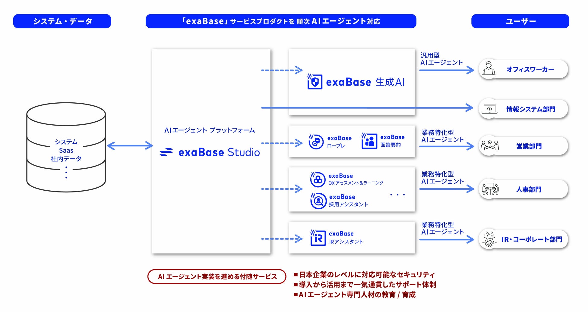 また、2025年夏以降に、幅広く普及している当社グループのexaBase 生成AIをユーザーインタフェースとして、exaBase Studioで開発したアプリケーションなどのアセットも含めて企業内で運用しているAIエージェント、当社グループで提供しているAIプロダクトのAIエージェント機能を利用できるようにしていきます。