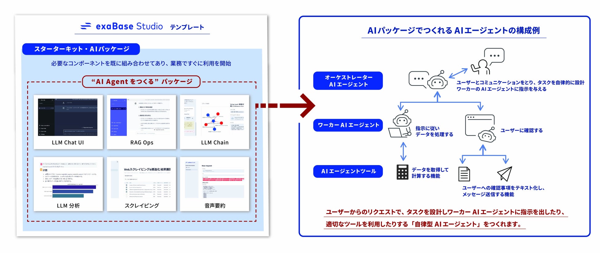 まず、2025年5月より、exaBase Studioのアプリケーションを構築するひな型であるテンプレートを利用して自律型を含めたAIエージェント対応のサービスを内製できるようにします。