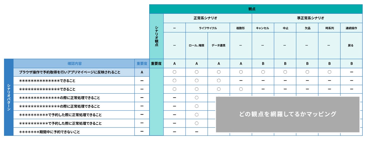 網羅的に洗い出されたシナリオのそれぞれの目的や、テスト観点を元に、分岐条件や特殊操作をマトリックス化して俯瞰することで、シナリオの取りこぼしや重複・禁則条件などを整理することで、お客様に代わって第三者的に検証業務を行うことができます。
