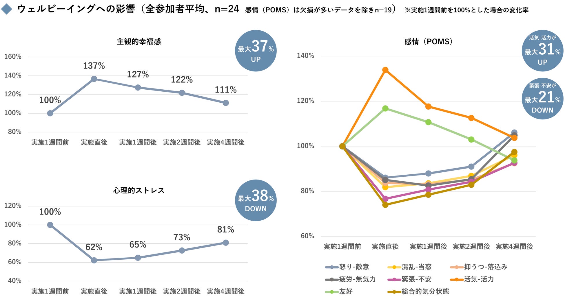 実証実験前後に計5回実施したアンケート検証結果より、瀬戸内でのワーケーションは、仕事のパフォーマンスやウェルビーイング指標などに改善効果がみられ、それらの効果は4週間持続することが確認されました。本検証では、ワーカーにとって定期的にこのような機会を持つことは、仕事とウェルビーイングの両面でエネルギーを満たす機会となり、 企業に有益性をもたらす可能性が十分あることを示す結果となりました。