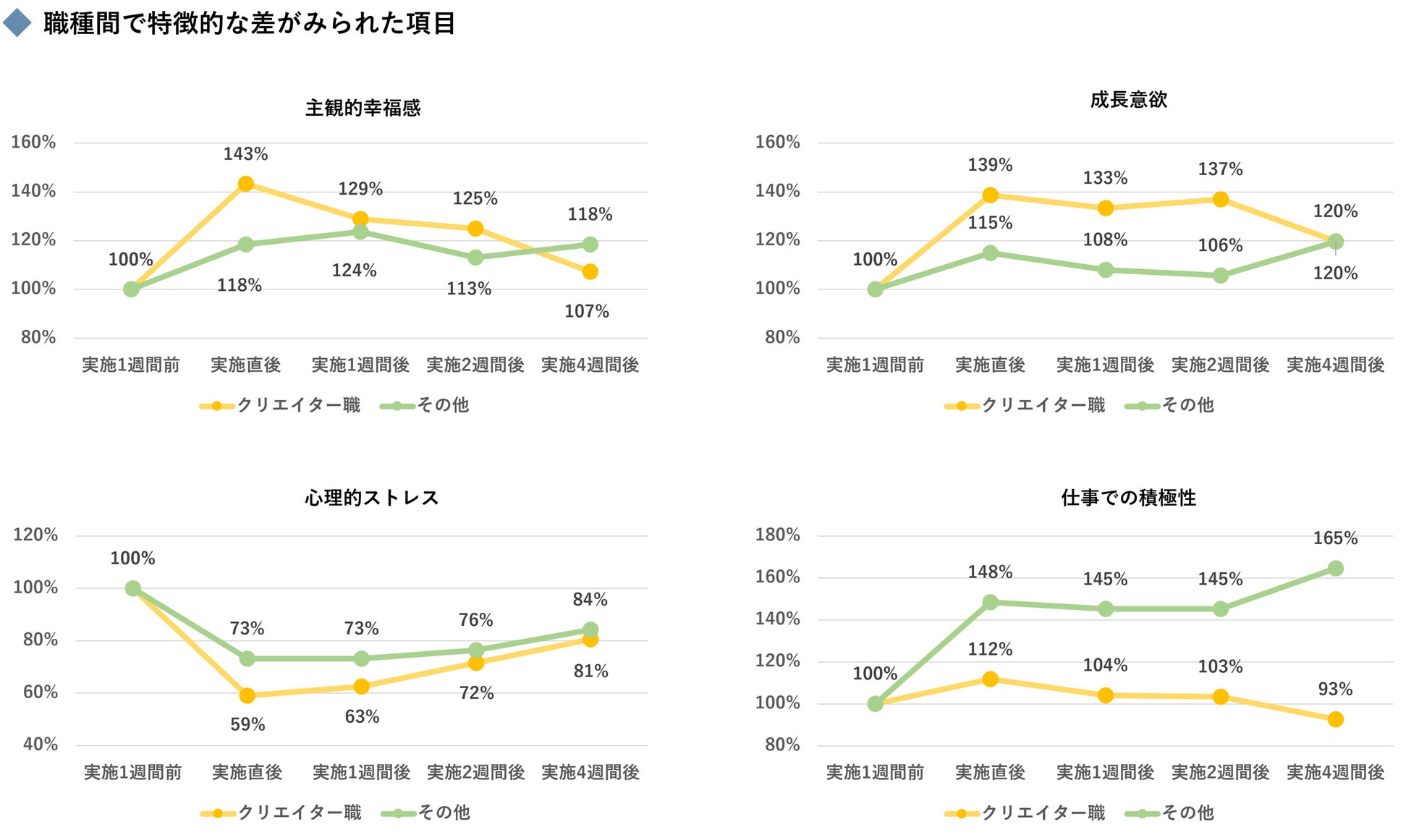 2.クリエイター系の職種は「主観的幸福感」「心理的ストレス」「仕事での成長意欲」に、その他の職種では、「仕事での積極性」によりよい影響がみられた。