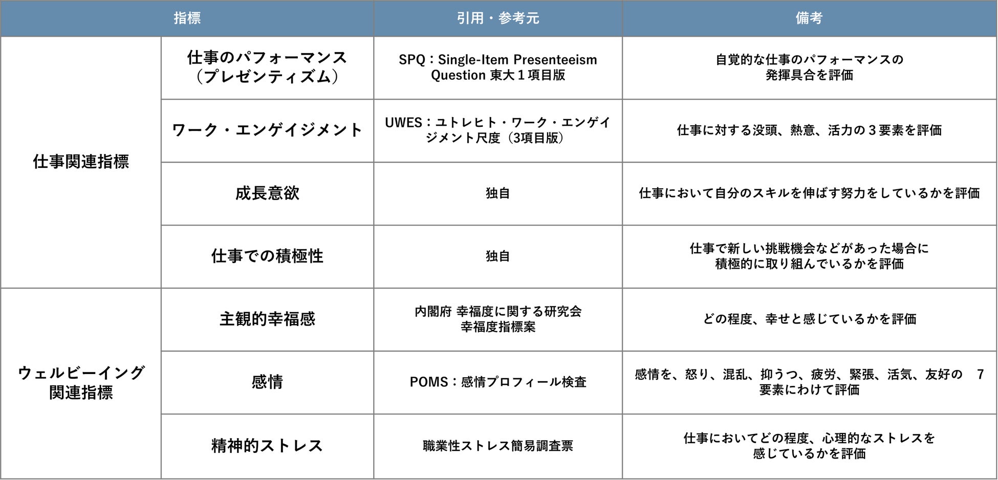 瀬戸内でのワーケーション体験は、ワーカーの仕事とウェルビーイングの両面に影響を及ぼす可能性があると考え、「仕事のパフォーマンス、ワーク・エンゲイジメント、成長意欲、仕事での積極性、主観的幸福感、感情、精神ストレス」の7つの指標を設定した。