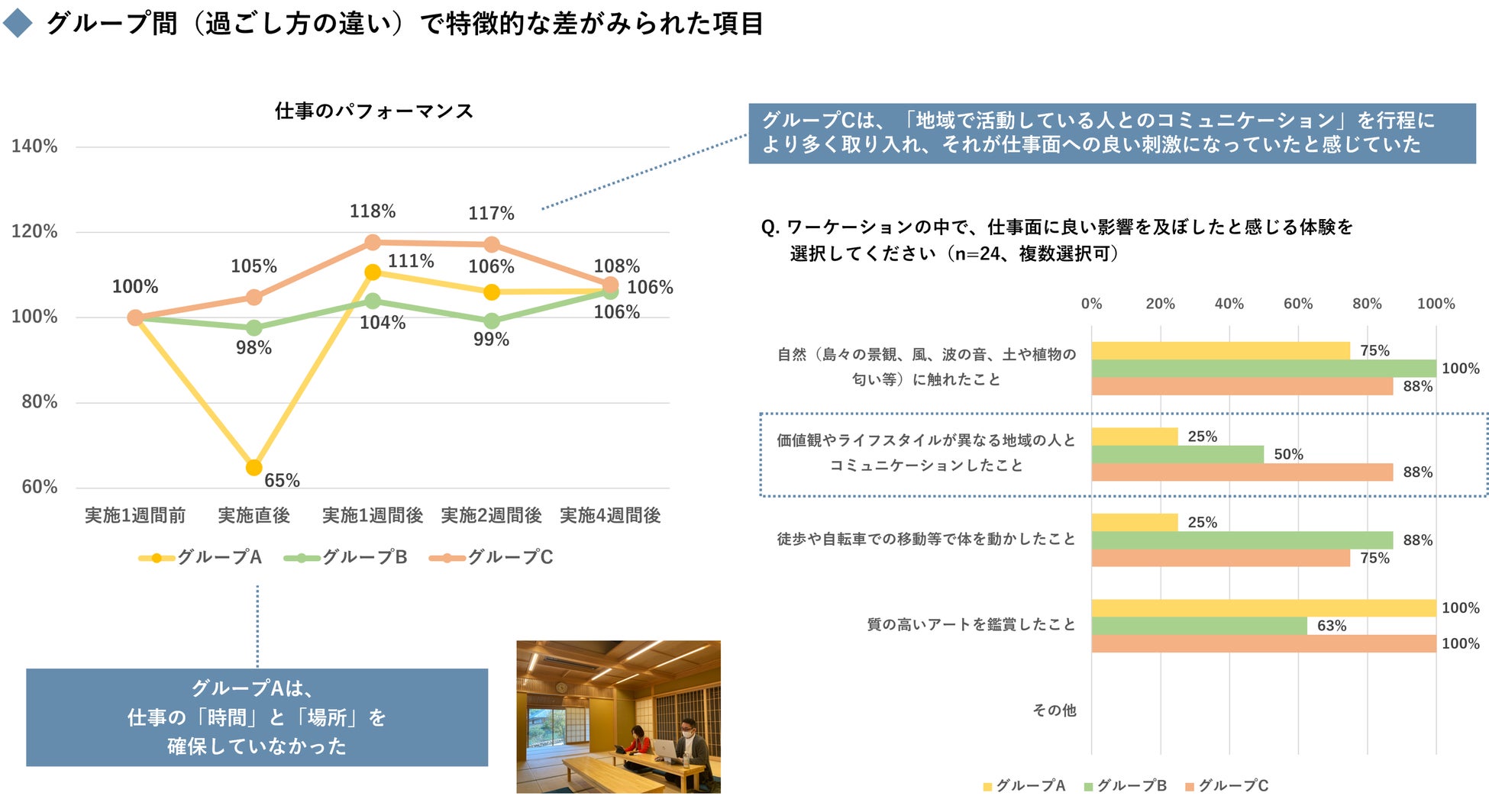 ・効果は、大きなスケールのアートとそれにゆっくりと向き合える島の環境がもたらしたものであると考えられます。また、アートへの嗜好性が高いクリエイティブワーカーは、瀬戸内ワーケーションの恩恵をより大きく受けることができると考えられます。一方、クリエイティブワーカー以外の職種には、仕事での積極性に大きな向上がみられ、新たなチャレンジに意欲的になる効果があると思われます。
