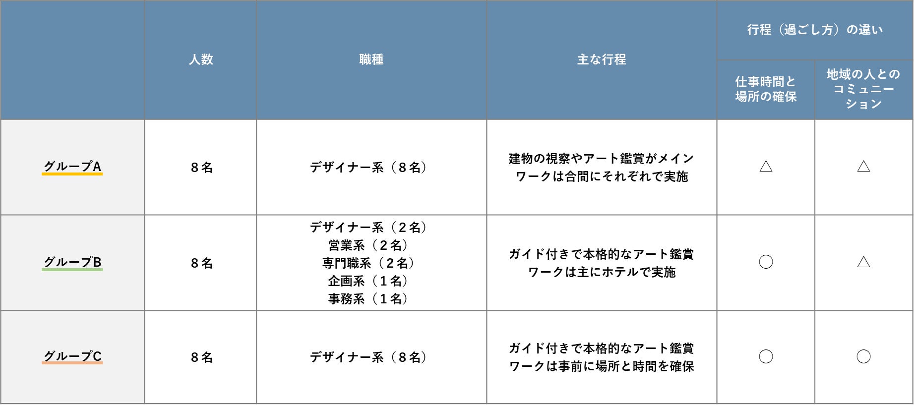 ・検証には3グループ計24名が参加し、グループ毎に異なる日程・行程でワーケーションを実施。