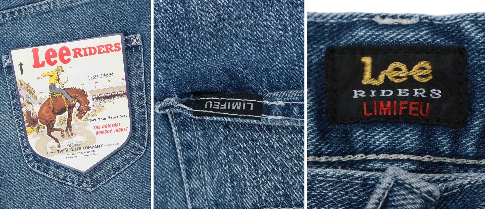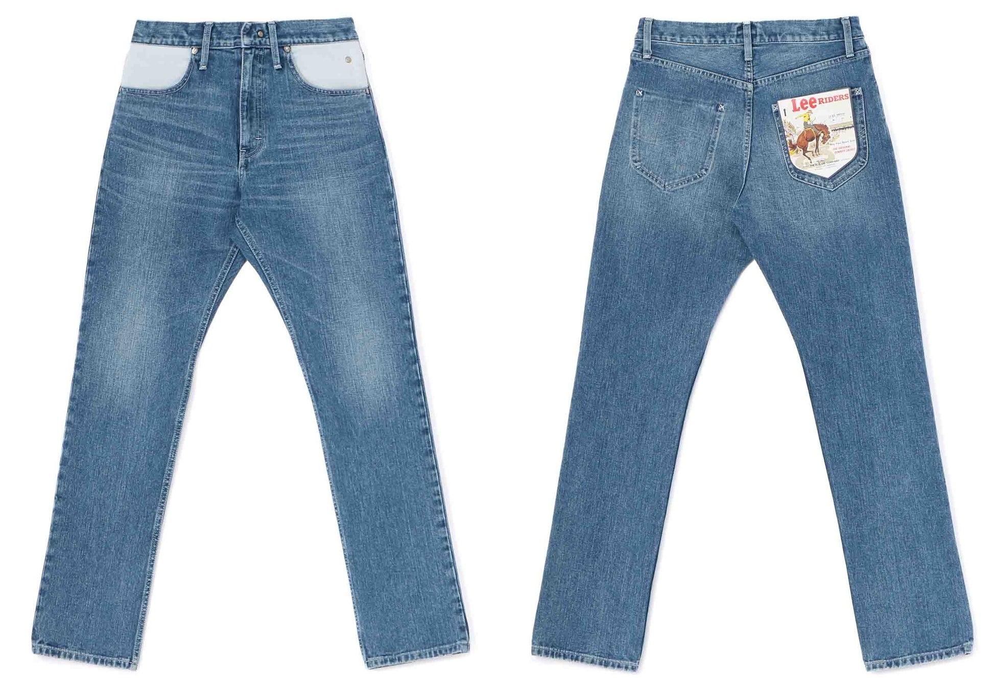 角が丸く縫われた特徴的な逆つり鐘型のバックポケットには、なだらかなS字を描くレイジーSステッチが施されている。またポケット口の両端に施されたX字の補強ステッチ「スレッドリベット」は、物や家具等を傷つけないよう金属リベットに代わって考案されたLee独自の仕様。バックポケットの内側にはLIMIFEUのピスネーム、後身頃のウエストベルトにはLee RIDERSとLIMIFEUのWネームを配置。躍動感のあるホースライドのイラストは、1940年代中頃からRIDERS用のフラッシャー(ペーパーカバー)として使用されているデザイン。