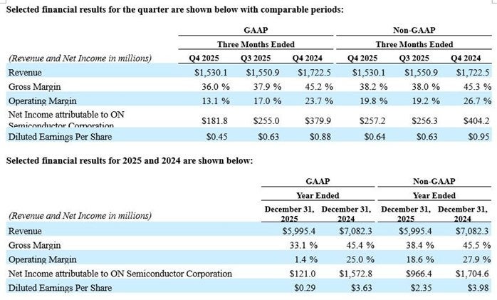 オンセミ(本社: 米国アリゾナ州スコッツデール、Nasdaq:ON)は、2025年第4四半期および2025年度の決算結果を発表しました。