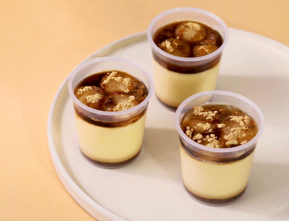 毎年、年末年始に販売している人気商品が今年も登場いたします。なめらかプリンに、もちもちな水まんじゅうをのせた「もちもちプリン」。付属の黒みつときなこをお好みでかけてお召し上がりいただけます。香ばしいきなこの香りと黒みつの濃厚な甘さ、なめらかプリンのコクを一緒にお楽しみいただけます。お正月ならではの和風スイーツをぜひご賞味ください。