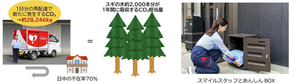 ヨシケイグループでは、1985年より留守しがちで防犯面の気になるお客さまへ「あんしんBOX」と呼 ばれる鍵付きの宅配ボックスの貸し出しをスタートいたしました。「あんしんBOX」をお客さまに有効活 用いただき、再配達ゼロを実現することでグループ全体で一日あたり約28,246kgのCO2の排出量を抑え ています。