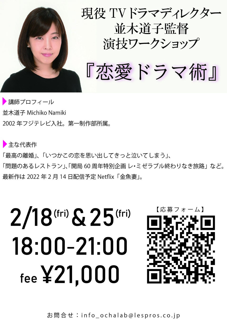 株式会社レプロエンタテインメントが運営する、エンタテインメントの溜まり場・御茶ラボにて、現役テレビドラマディレクターによるワークショップを開催することが決定しました。講師には株式会社フジテレビジョンのディレクターとして多くの恋愛ドラマの演出を手掛けられ、配信前からすでに話題となっている「金魚妻」(2022年2月14日Netflix配信予定)の監督をされた並木道子監督をお招きします。