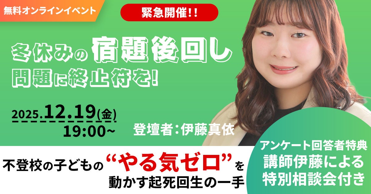 2025年12月19日(金)19:00~19:30、キズキ共育塾(※)は「冬休みの課題を後回しにしてしまう不登校のお子さん」について悩む保護者様を対象に、無料のオンラインイベントを開催します。