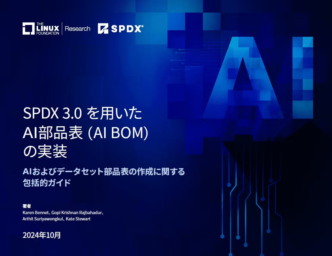 LF ResearchとSPDXにより作成されたレポート「Implementing AI Bill of Materials (AI BOM) with SPDX 3.0」の日本語版「SPDX 3.0を用いたAI部品表 (AI BOM) の実装」が公開されました。