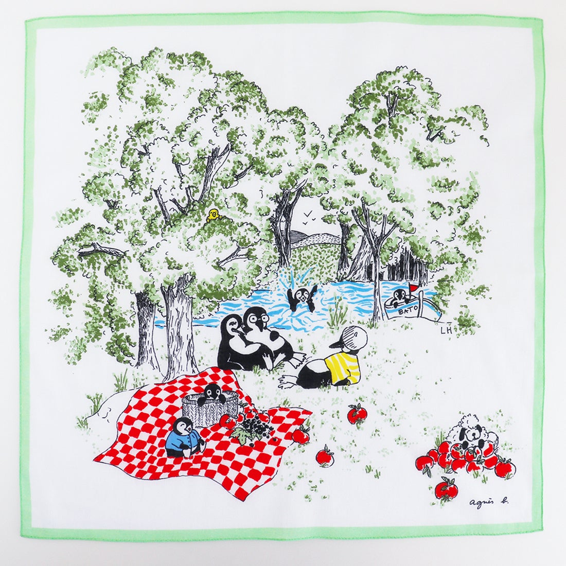 agnès b.の新作ハンカチーフは、都会を離れ、自然の中でくつろぐ癒しのひとときをイメージしたデザインで、親子でも楽しめるコミカルなイラストが印象的です。テーマカラーのグリーンが効いた一枚。