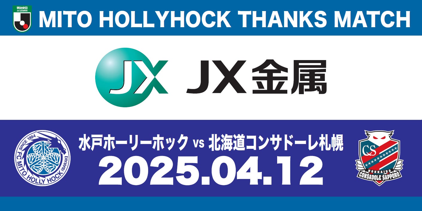 このたび、4月12日(土)に開催するホームゲーム、2025明治安田J2リーグ第9節 水戸ホーリーホック vs. 北海道コンサドーレ札幌をJX金属株式会社にご支援いただき『JX金属サンクスマッチ』として開催いたします。