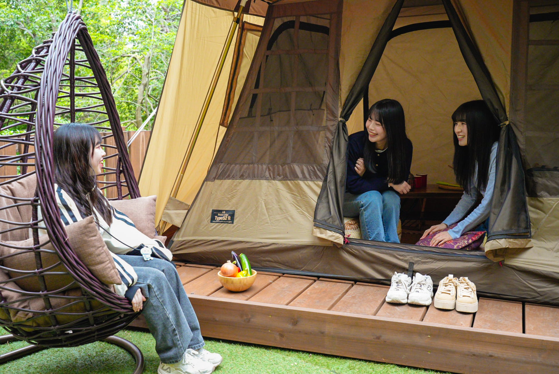 またサイト内にはグランピングのように快適に過ごせるテントやハンモックが設置。